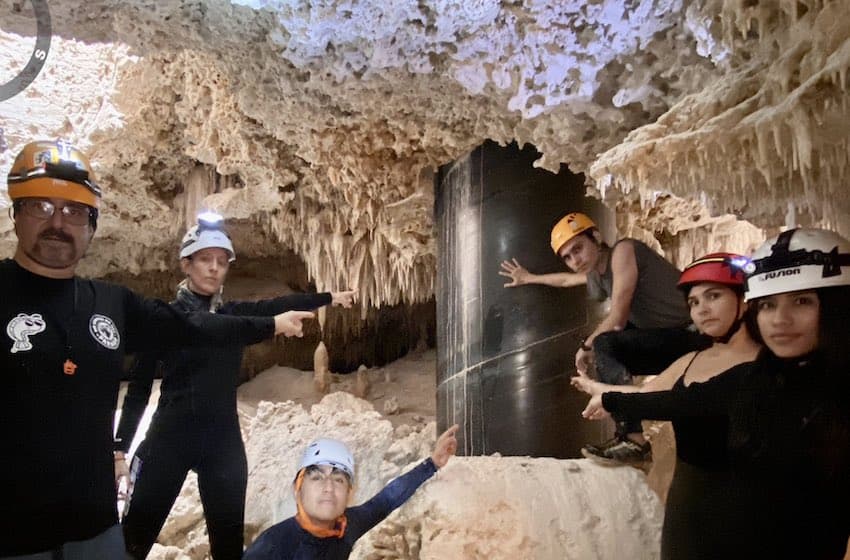 Members of two environmental groups that assert that the construction and operation of the Maya Train railroad is harming the environment visited caves in the Aktun T’uyul system south of Playa del Carmen in Quintana Roo on Sunday.