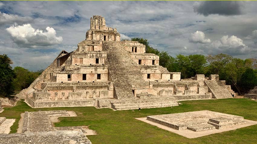 The most remarkable structure at Edzná is the 40-meter-high temple in the main plaza, but the site also features groupings such as the Grand Acropolis and structures including a ball court and a 31-meter-high structure known as Cinco Pisos.