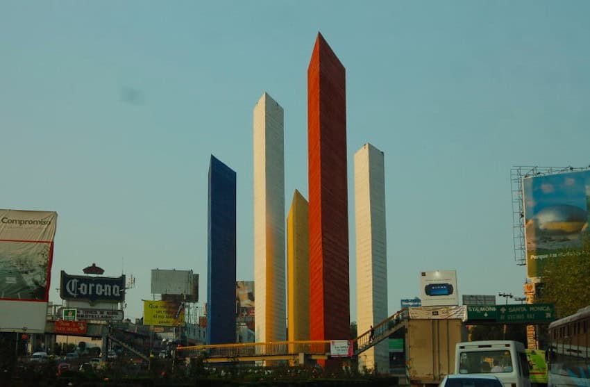 In 1954, Pani started on his master plan for Ciudad Satélite, a residential suburb in Naucalpan de Juárez, Mexico State. He invited Luis Barragán, who then incorporated Mathias Goeritz, to help design a powerful visual that would not only serve as a visible marker from the highway but also as part of a promotional campaign for the project. The resulting towers were inspired by two bold skylines: San Gimignano’s medieval tower houses in Tuscany and the modern skyscrapers of Manhattan. These massive structures can be seen today when driving on Highway Periferico.