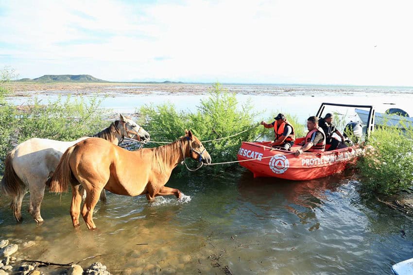 On Tuesday, Nuevo León Civil Protection officials rescued at least 40 stranded horses on an islet in the Cerro Prieto dam, according to Governor Samuel García.